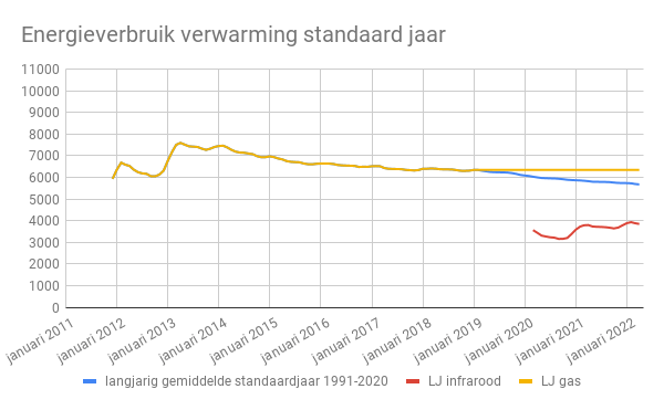 Bovenstaande grafiek laat het gemiddeld energiegebruik voor verwarming zien met aardgas en met infraroodverwarming. Ook is duidelijk zichtbaar dat het langjarig gemiddelde daalt sinds we infraroodverwarming gebruiken.