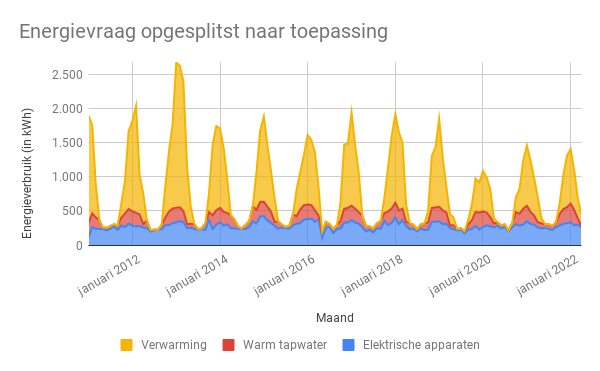 Bovenstaande grafiek laat onze maandelijkse energievraag zien. Daarin is goed zichtbaar dat onze vraag naar energie niet gelijk oploopt met de productie van een zonnepaneel. De piekvraag zit in de winter, het piekaanbod van onze zonnepanelen in de zomer. Reden om onze zonnepanelen aan te vullen met winddelen.