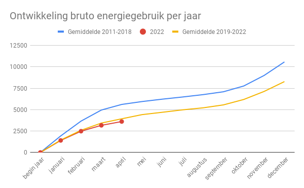 Ons bruto energiegebruik tot en met april ligt 300 kWh lager dan vorig jaar. Dat is een daling van 8% ten opzichte van het gemiddelde energiegebruik in de jaren 2019-2021 (infraroodverwarming). Ons energiegebruik ligt 30% lager dan het gemiddelde energiegebruik in de periode 2011-2018 (hr-ketel).