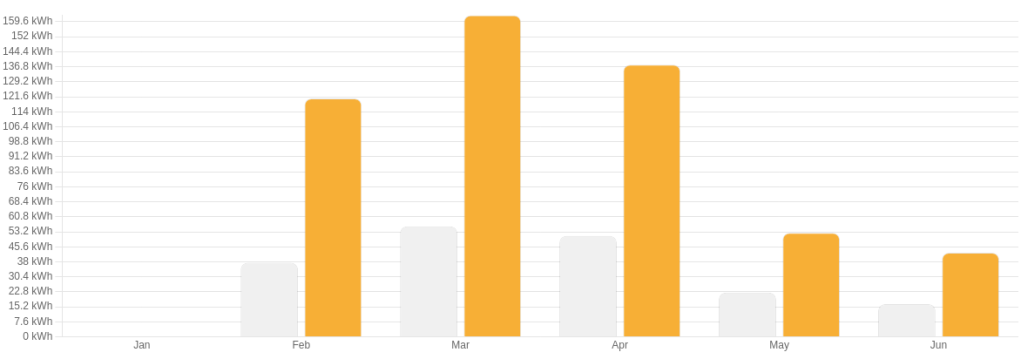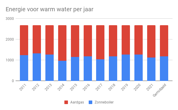 In bovenstaande grafiek is te zien dat ons energiegebruik voor warm water constant is. Dat is een aanname op basis van 20% van het gasverbruik voor een label C woning in 2012. Op basis daarvan schat ik ons gasverbruik voor verwarming en warm water in. Per maand gaat het om 223 kWH. In de periode 2019 t/m 2021 hebben we gas enkel gebruikt voor warm water. Gemiddeld heeft onze zonneboiler jaarlijks ongeveer 1.200 kWh aan warm water opgeleverd. Dat is 45% van ons warme water.