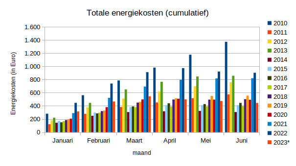De totale energierekening voor het eerste jaar bedraagt zo’n 900 Euro. Daarmee zijn we terug op het niveau van 2013.