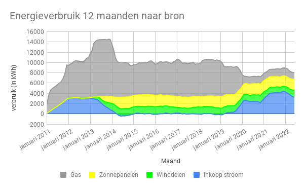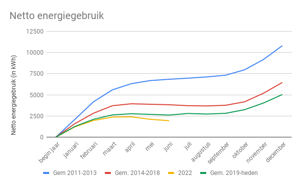 Dat komt deels doordat het eerste half jaar milder was dan het eerste half half jaar van 2021 (18% minder graaddagen), deels doordat we minder energie nodig hebben gehad voor warm water en een heel klein beetje doordat we 1% energie hebben bespaard op onze apparatuur.