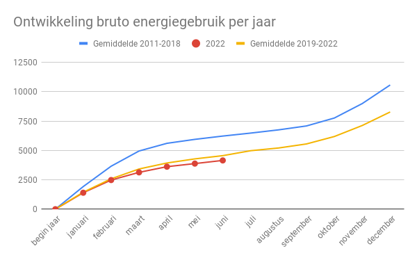 Ons netto energiegebruik is gedaald ten opzichte van vorig jaar. Dat komt met name doordat we meer elektriciteit opwekken, doordat we winddelen bij hebben gekocht. Ons netto elektriciteitsgebruik is daardoor gedaald van bijna 2.700 kWh in de eerste helft van 2021 naar een kleine 1500 kWh in 2022.