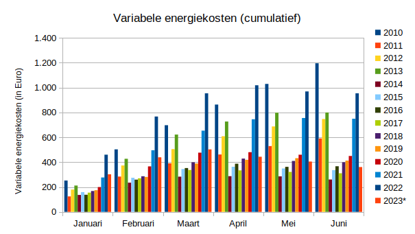 Op onze totale variabele kosten scheelt dat in de eerste helft van 2022 ruim 15%. Tot en met juni bedragen deze 954 Euro. Volgend jaar, als de winddelen het volledige eerste half jaar meetellen dalen ze naar verwachting tot minder dan Euro 400. Als we afgelopen jaren geen maatregelen hadden genomen waren onze variabele energiekosten over het eerste half jaar ruim Euro 3.000 geweest. Dus je hoort me niet klagen over de lagere terugleververgoeding. Het geeft een goede aanleiding om serieus over energieopslag na te gaan denken. Een grotere aanleiding dan het afschaffen van de salderingsregeling.