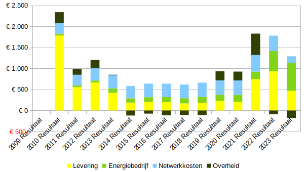 Bovenstaande grafiek laat zien dat we verwachten dat onze energierekening in 2022 uitkomt op een kleine Euro 1.700. Voor volgend jaar verwachten we dat deze daalt naar Euro 1.100, uitgaande van de huidige tarieven. Wat een linke aanname is, aangezien de tarieven voor de 1.500 kWh die we op jaarbasis in blijven kopen omhoog kunnen, evenals de onbalans vergoeding. Ook kan de vergoeding voor teruggeleverde stroom verder omlaag of kan de overheid aan de tarieven gaan knutselen.