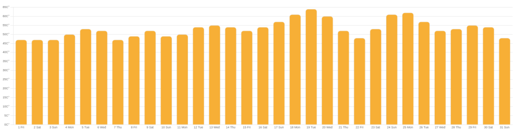 In juli kwam de grootste energievraag van apparatuur met 220 kWh, de HeatCycle heeft slechts 9 kWh gebruikt. De rest van het warme water is geleverd door onze zonneboiler. Juli was dan ook zonnig genoeg om de gemiddelde temperatuur in de boiler met regelmaat boven de 60 graden te krijgen. De legionella preventie werd daarmee geleverd door de zon.