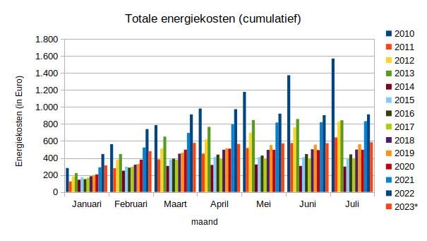 Onze totale energiekosten bedragen tot en met juli 900 Euro, volgens mijn eigen berekening. Volgens GreenChoice hebben we dit jaar tot nu toe 860 Euro aan kosten. Bij GreenChoice moeten de opbrengsten van onze winddelen er nog van af. Het verschil daartussen zit waarschijnlijk in de wijze waarop de teruggeleverde elektriciteit van onze zonnepanelen wordt verrekend. Als ik de tarieven van Greenchoice bekijk lijkt het er op dat we voor teruglevering nog slechts 8 Eurocent krijgen, terwijl de berekeningen in hun klantportaal nog uitgaan van 100% salderen. Vooralsnog ga ik uit van de lagere terugleververgoeding in hun tarieven overzicht. Dan kan de eindafrekening enkel meevallen. Zonder maatregelen was onze energierekening over de eerste 7 maanden van het jaar ruim 3.400 Euro geweest.