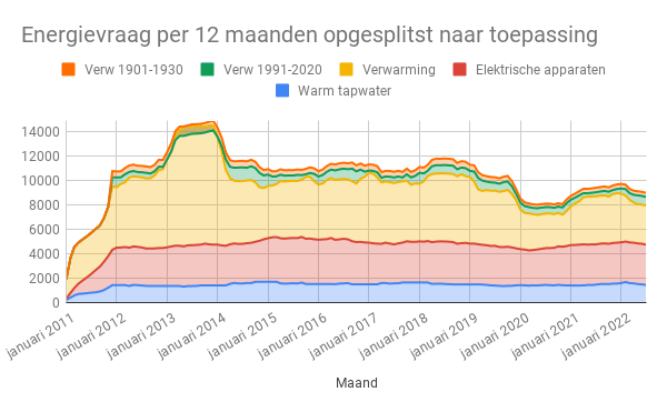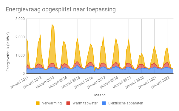 Het grootste deel van het energiegebruik gaat tot juli op aan elektrische apparaten met 1.908 kWh, daarna komt verwarming met 1.792 kWh en de kleinste vraag komt van warm water met 684 kWh. Waarvan 204 kWh het elektriciteitsgebruik is van de HeatCycle.