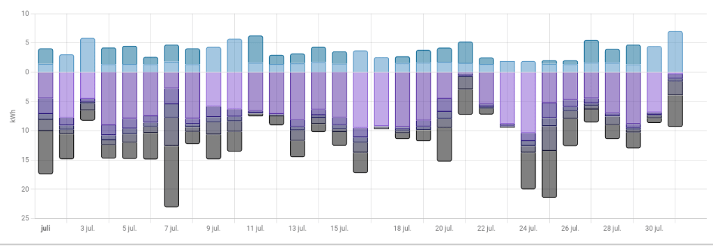 In juli hebben onze zonnepanelen en winddelen samen 230 kWh meer geproduceerd dan we gebruikt hebben. Onderstaande grafiek laat zien dat we in juli nagenoeg elke dag meer hebben geproduceerd dan gebruikt.