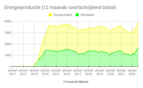 Onze totale energieproductie van zonnepanelen en winddelen zit al het hele jaar in de lift. Inmiddels naderen we 4.000 kWh op jaarbasis. Onze zonneboiler en warmtepomp produceren ook energie, maar die heb ik in onderstaand plaatje niet meegenomen. Ik kijk enkel naar de energie die ik via een netwerk afneem of teruglever.