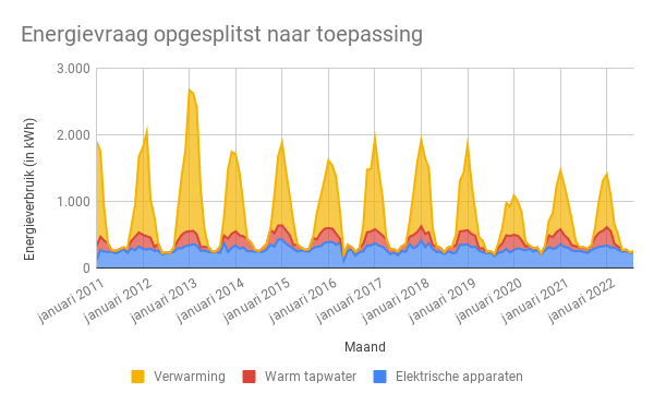 Op jaarbasis valt op dat de hoeveelheid energie die nodig is voor warm water sinds de installatie van de HeatCycle langzaam aan het dalen is. Al zal dat deels ook te maken hebben met de hoeveelheid zonneschijn in augustus. Ons totale energiegebruik is op jaarbasis onder de 8.000 kWh aan het zakken. Zonder klimaatverandering zou ons energiegebruik 1.000 kWh hoger liggen.
