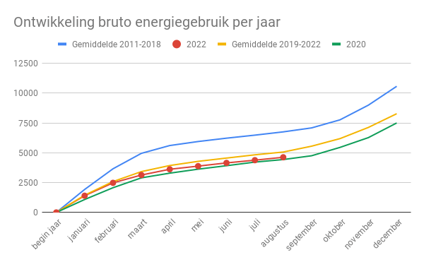 Eind februari hebben we onze cv-ketel uitgezet. Dat betekent dat we inmiddels een half jaar geen aardgas gebruikt hebben in huis. Ons bruto energiegebruik voor 2022 komt tot en met augustus op 4.600 kWh (gas en elektra) en kruipt langzaam maar zeker dichter tegen dat van 2020 aan. Het zuinigste jaar sinds we in 2010 ons huis kochten, uitgaande van het bruto energiegebruik. Zonder onze zonnepanelen en winddelen mee te rekenen scoren we nog steeds NegaWatts. Als ik daar wel rekening mee hou ligt ons energiegebruik 12% lager dan in 2020.
