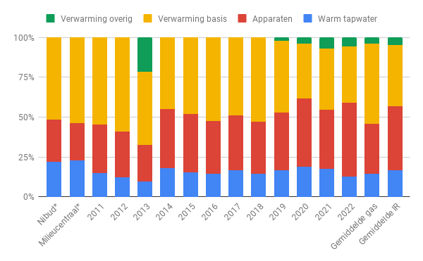 Ons totale energiegebruik gaat voor 47% op aan elektrische apparaten (verlichting, mechanische ventilatie, fornuis, oven, wasmachine, koelkast etc), voor 40% aan verwarming en de resterende 13% is voor warm water. Heel anders dan in 2011, toen nog ruim 55% van ons energiegebruik op ging aan verwarming.