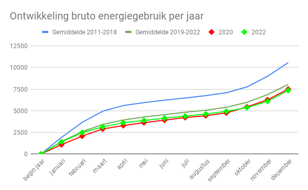 Ons bruto energiegebruik is in 2022 op 7.397 kilowattuur aan elektriciteit en aardgas uitgekomen, 2% lager dan in 2020 (ons meest energiezuinige jaar tot nu toe). Ten opzichte van 2021 hebben we 17,5% energie bespaard. Dat heeft niet gecompenseerd voor de hogere energiekosten.