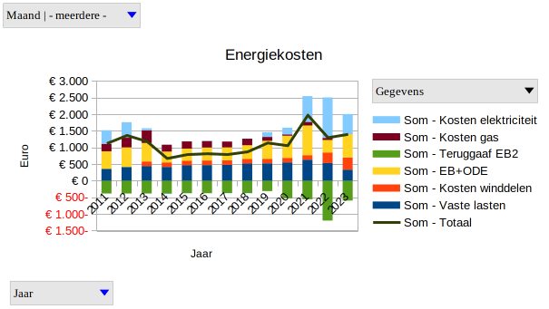 In 2022 hebben we in totaal Euro 1.307 aan energiekosten gehad, waarvan Euro 125 aan afschrijvingskosten voor onze winddelen. Aan het energiebedrijf betaalde we zodoende minder dan Euro 1.200. De rekening bestond uit: