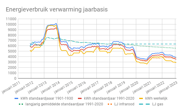 Ook op jaarbasis is het energiegebruik voor verwarming gedaald. In werkelijkheid ligt het nu op 2.900 kWh. Wanneer ik dat corrigeer voor het weerseffect zouden we in de periode 1991-2020 3.501 kWh hebben verbruikt. Als ik corrigeer voor klimaatverandering sinds 1901-1930 dan zouden we 3.798 kWh hebben gebruik.