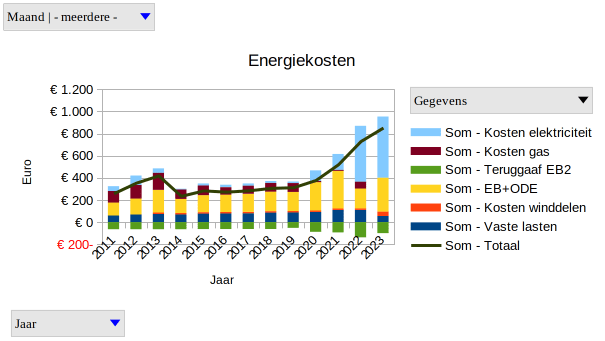 In de eerste twee maanden van het jaar bedragen onze energiekosten 855 Euro, een stijging met 17% t.o.v. 2022. Het grootste van de stijging bestaat uit de toegenomen kosten voor energiebelasting. De gestegen kosten voor elektriciteit worden meer dan gecompenseerd door de gedaalde kosten voor aardgas en de gedaalde vaste lasten (netwerkkosten en leveringskosten aardgas).