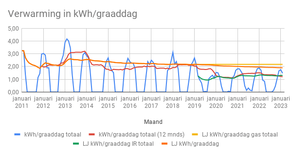 Bovenstaande grafiek laat zien dat we sinds we overgestapt zijn op infraroodverwarming van ThermIQ niet meer boven de 2 kWh/gewogen graaddag zijn uitgekomen. Traditiegetrouw ligt de piek in het gebruik voor verwarming in januari/februari. In februari lag het verbruik op 1,5 kWh/gewogen graaddag. Dat is 15% zuiniger dan in 2022. Waardoor we de ondanks de stijging door koudere dagen toch minder elektriciteit hebben gebruikt dan in februari 2022.