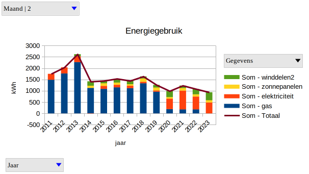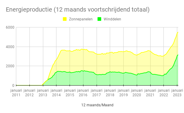 Op jaarbasis produceren we nu ruim 5.500 kWh. Waarvan bijna 3.200 kWh van onze winddelen. Op jaarbasis is de verwachting dat deze gemiddeld 4.500 kWh opleveren, maar ik vermoed dat dat wat lager uit zal komen.