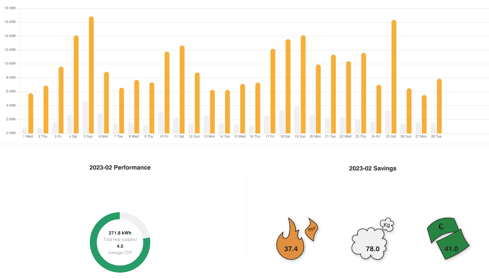 In februari heeft onze HeatCycle 61 kWh gebruikt voor het maken van warm water. Dat is een besparing van 72% t.o.v. het energiegebruik in februari 2022.