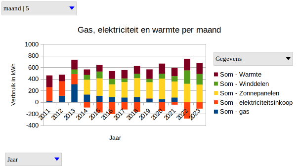 In mei hebben we 563 kWh aan energie gebruikt en 113 kWh aan elektriciteit teruggeleverd aan het net. Onderstaande grafiek laat de opbouw van ons energiegebruik en de energieproductie zien.