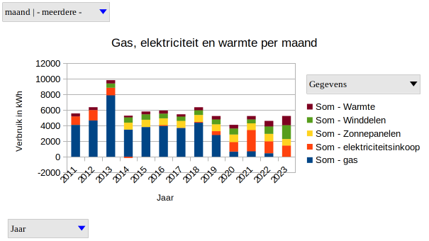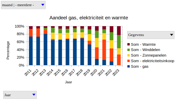 Het aandeel aardgas ligt dit jaar voor het eerst op nul. Na 12 jaar wordt 2023 het eerste volle kalenderjaar met een jaarverbruik van 0 m3. Dat blijft ook zo, want de gasaansluiting en gasmeter zijn volledig verwijderd. Daardoor is het aandeel duurzame warmte gestegen van 15 naar ruim 20% in onze energiemix. Ook het aandeel windenergie is gestegen door de aanschaf van extra winddelen.