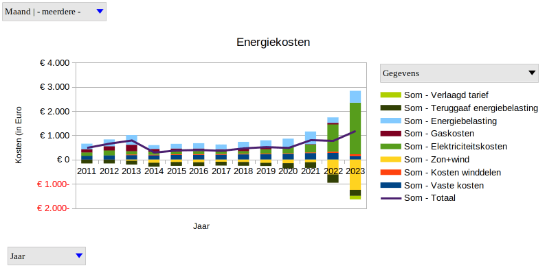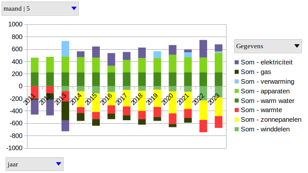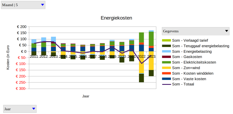 De eerste vijf maanden van het jaar hebben we in totaal Euro 1.191 aan energiekosten gehad, ruim Euro 300 meer dan in 2021 en 2022 en ruim 500 Euro meer dan in de periode 2014-2020.