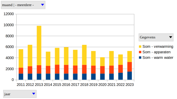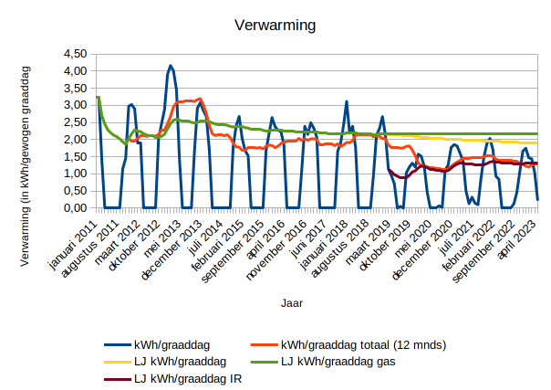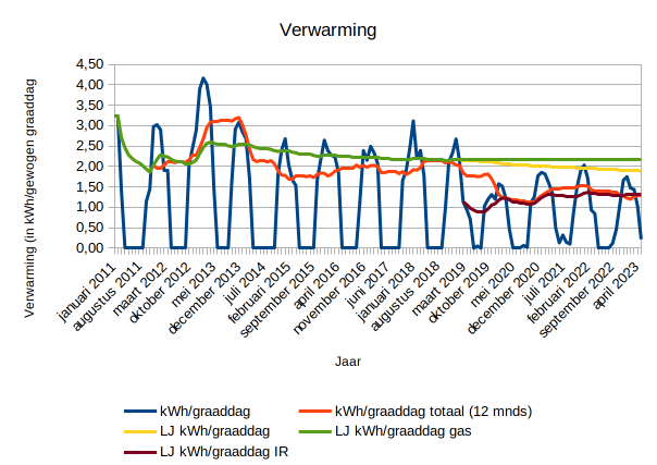 Die 1,31 kWH/gewogen graaddag is 40% minder dan toen we verwarmde met een hr-ketel. Het langjarig gemiddelde sinds we hier wonen is inmiddels gedaald van 2,17 kWh/gewogen graaddag in de periode dat we verwarmde met aardgas naar 1,89 kWh/gewogen graaddag.