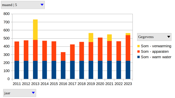 Het energiegebruik lag in mei 2023 hoger dan in mei 2020. Deels kwam dat doordat we langer gestookt hebben, deels doordat mei minder zonnig was en onze zonneboiler een onderhoudsbeurt nodig heeft. Hierdoor heeft onze warmtepomp harder moeten werken. Da’s niet terug te zien in onderstaande grafiek, maar ik vermoed toch echt dat de warmtepomp een aantal keer een anti-legionella cyclus heeft gemaakt, terwijl dat in mei 2022 niet nodig was. Vorig jaar was ons boilervat bijna de hele maand een aantal keer boven de 60 graden Celsius. Door problemen met onze zonneboiler is dat afgelopen maand nog niet voorgekomen.