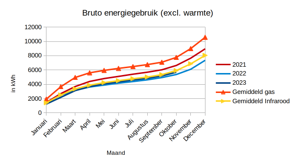 Ons bruto energiegebruik exclusief warmte ligt nog wel 4% onder het gemiddelde sinds onze overstap naar infraroodverwarming. Ten opzichte van het gemiddelde bruto energiegebruik met cv-ketel ligt ons bruto energiegebruik 24% lager.