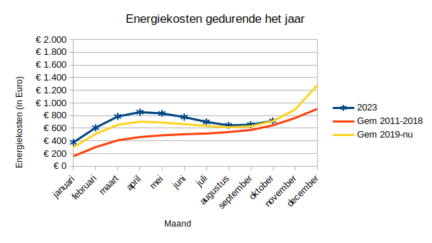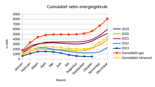 Ons energiegebruik lag in oktober op 679 kWh, dat is 12% hoger dan in oktober 2022. De oorzaak? Blijft nog even gissen, maar ik vermoed dat onze haperende zonneboiler er mee te maken heeft. Ondanks dat ligt ons gemiddelde bruto energiegebruik 16% lager dan het gemiddelde ten tijde van onze CV-ketel.