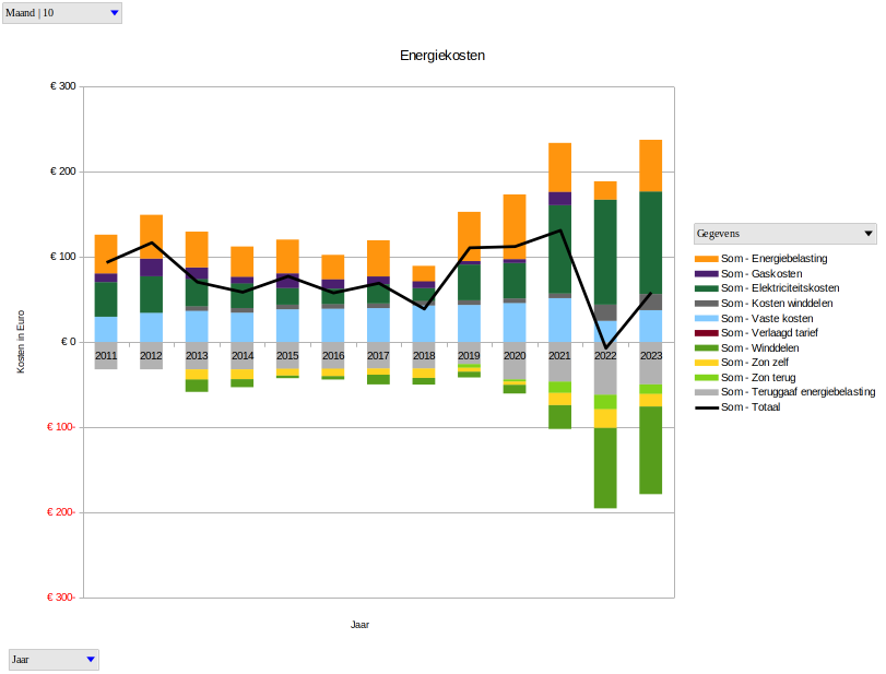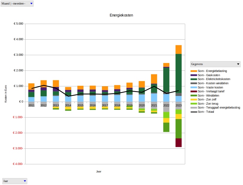In de eerste 10 maanden van dit jaar zijn de elektriciteitskosten behoorlijk hoger dan voorgaande jaren. Het effect hiervan wordt voor een groot deel gedempt door onze zonnepanelen en winddelen. Ook het verlaagd tarief heeft daar de eerste maanden van dit jaar aan meegeholpen. De kosten van de energiebelasting zijn dit jaar een stuk hoger dan in 2022, toen het tarief tijdelijk verlaagd werd.