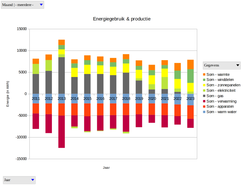 Ons bruto energiegebruik inclusief warmte over de eerste 10 maanden van 2023 ligt met een kleine 8.000 kWh bijna 30% hoger dan over de eerste 10 maanden van 2022. Bijna 40% van de energievraag in de eerste tien maanden betrof apparaten, 25% verwarming en 35% warm water. De verwachting is dat het aandeel verwarming de laatste twee maanden nog wel wat oploopt.