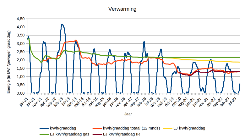 Het aantal gewogen graaddagen was 133, 3% meer dan in oktober 2022. We hebben 0,59 kWh/gewogen graaddag gebruikt. Dat is 28% meer dan in oktober 2022. Toch is goed te zien in bovenstaande grafiek dat ons energiegebruik per gewogen graaddag op jaarbasis nog steeds lager ligt dan met onze hr-ketel. In kWh per gewogen graaddag scheelt het 40%.