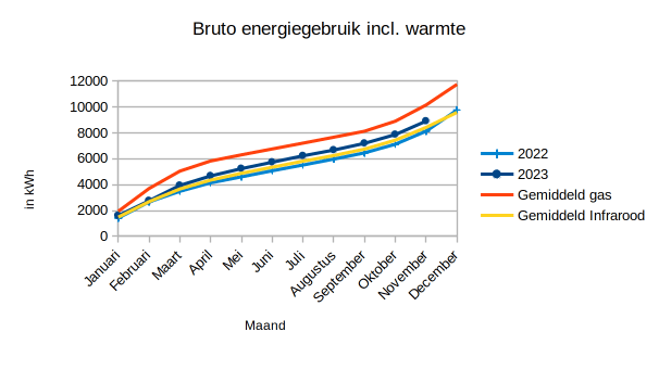 Het totale energiegebruik over januari t/m november ligt 10% hoger dan in 2022. Toch ligt het nog steeds 17% lager dan in de jaren met een cv-ketel en zonneboiler. Vermoedelijk gaat het niet meer lukken om dit jaar onder de 10.000 kWh te blijven. Ons energiegebruik lag de eerste 11 maanden van dit jaar 6% hoger dan gemiddeld sinds de overstap op infraroodverwarming.