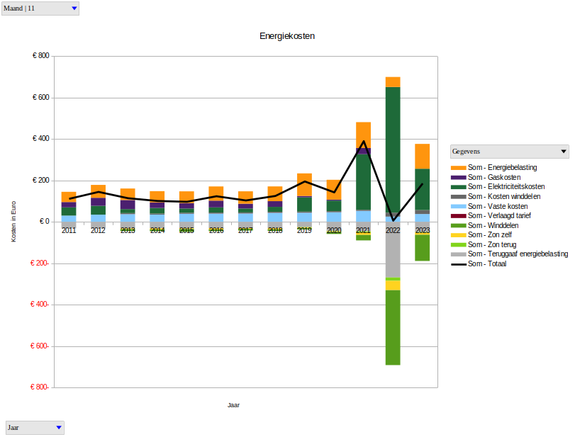Met zo’n 1.000 euro aan energiekosten over de eerste 11 maanden hoor je me echter niet klagen. Ondanks de gestegen energietarieven lijken onze energiekosten zo rond de 110 euro per maand uit te gaan komen, tenzij december een hele koude en windstille maand wordt.