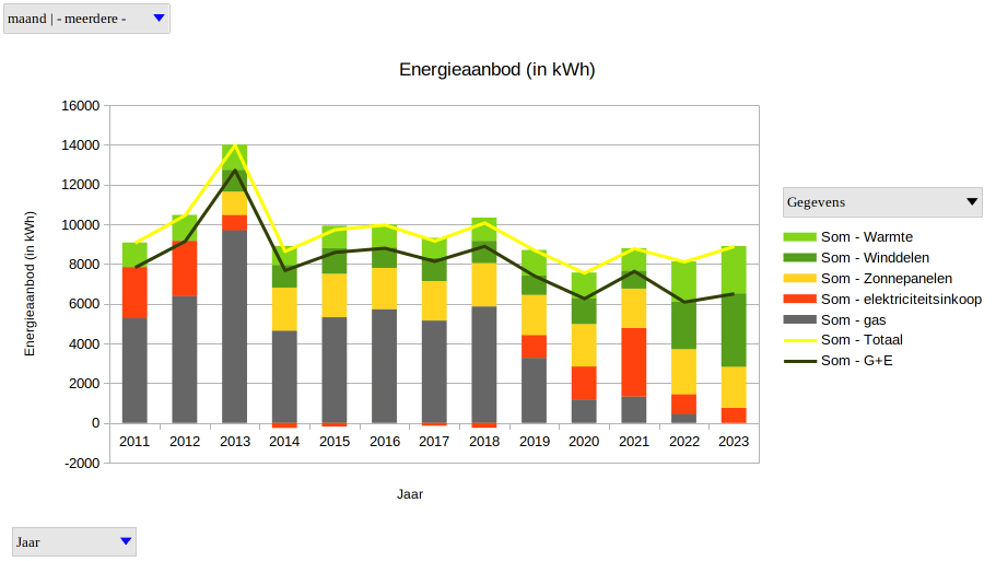 Tot en met november is de hoeveelheid aardgas gedaald ten opzichte van voorgaande jaren en ook de hoeveelheid elektriciteit die we netto inkopen is weer gedaald. Nog niet tot het niveau uit de periode 2014-2018, maar de piek uit 2020-2021 is duidelijk weggewerkt. Wat ook opvalt is dat onze winddelen het dit jaar beduidend beter doen dan in 2022.