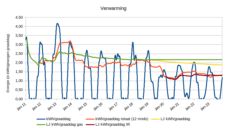 Op jaarbasis ligt ons gebruik voor verwarming gecorrigeerd voor weersinvloeden redelijk constant. In november lag dit op 4.091 kWh/jaar (omgerekend zo’n 401 m3 aardgas). Met aardgas lag dit verbruik gemiddeld op 6.878 kWh per jaar (zo’n 688 m3 aardgas). Daarmee besparen we door onze infraroodverwarming 41% ten opzichte van stoken met aardgas. Een standaardklimaatjaar reken ik daarbij terug naar het gemiddelde stookseizoen in de periode 1901-1930. Het aantal gewogen graaddagen lag de afgelopen 12 maanden 23% lager dan in de periode 1901-1930.
