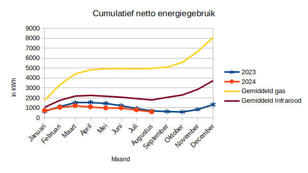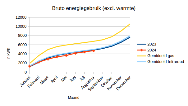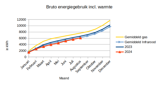 Het bruto energiegebruik (inclusief warmte) over de eerste 8 maanden van 2024 ligt met 6114 kWh 8% lager dan in 2023 en 2% lager dan het gemiddelde over de periode sinds we overgestapt zijn op infraroodverwarming. Het bruto energiegebruik over de eerste 8 maanden is nog steeds ruim 600 kWh hoger dan in 2020.