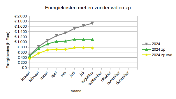 Onderstaande grafiek laat de ontwikkeling van onze energiekosten tot en met augustus zien. In geel de ontwikkeling van de kosten met zonnepanelen en winddelen. In groen de ontwikkeling als we enkel zonnepanelen zouden hebben en in grijs de ontwikkeling van onze energiekosten zonder zonnepanelen en winddelen.