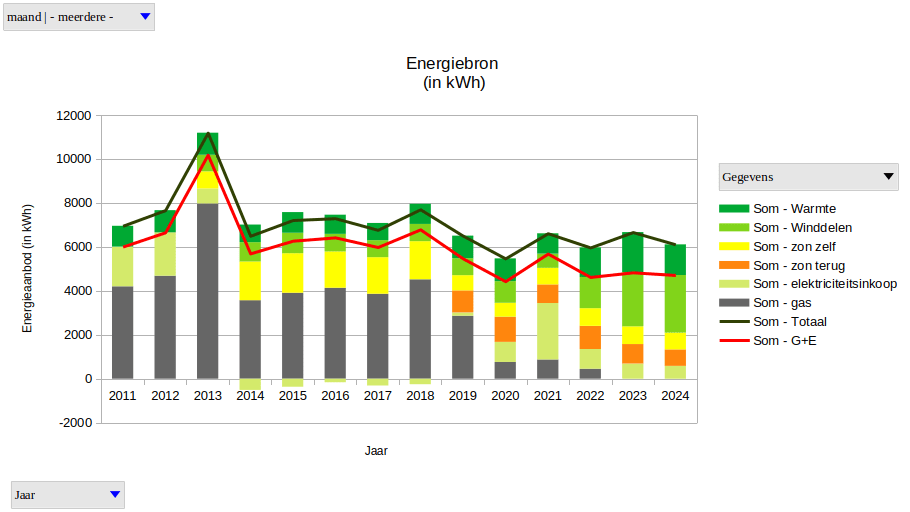 In bovenstaande grafiek is daarnaast goed zichtbaar dat we het gebruik van aardgas in 10 jaar tijd volledig hebben afgebouwd in ons huis.