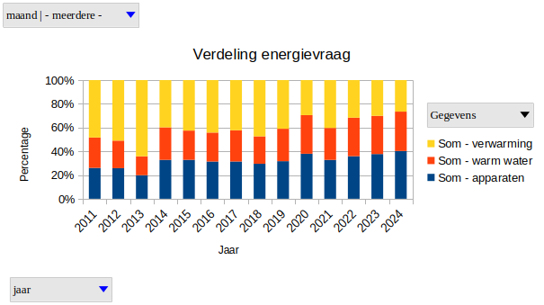 Bovenstaande grafiek laat zien dat het aandeel verwarming in onze energievraag de afgelopen 13 jaar gedaald is van 50-60% naar 30-40%. Het aandeel warm water en elektrische apparaten is in de loop der jaren juist gestegen.