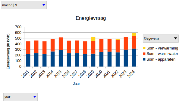 Ons energiegebruik lag in september hoger dan in voorgaande jaren. Da komt vooral door ons stookgedrag. In tegenstelling tot eerdere jaren hebben we in september wel gestookt. Ook het energiegebruik van apparaten loopt gestaag weer op. Waarschijnlijk veroorzaakt door onze Quooker en andere keukenapparatuur. Hoewel de nieuwe apparatuur zuiniger is dan de oude, betekent het weer hebben van vier pitten (i.p.v. 3) en een magnetron dat we zo ook gebruiken.
