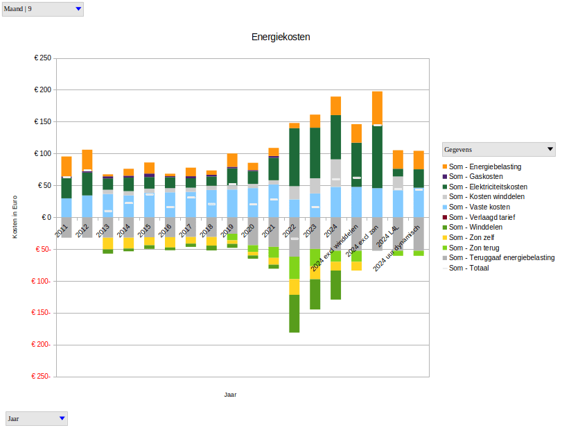 Ondanks de stijging van de vaste lasten leveren onze winddelen ons in de eerste 9 maanden van het jaar een besparing op van Euro 230. Onze zonnepanelen hebben ons Euro 340 bespaart in de eerste 9 maanden van het jaar.